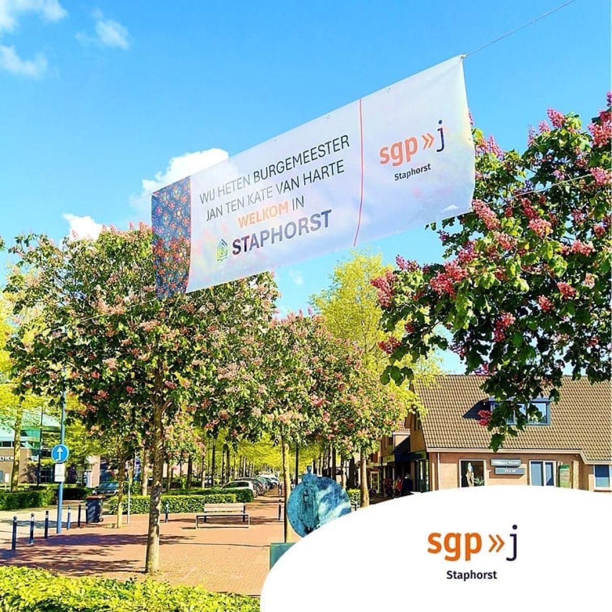 Om burgemeester Ten Kate welkom te heten hebben wij bij de rotonde een spandoek opgehangen. Op het spandoek stond: 'Wij heten burgemeester Jan ten Kate van harte welkom in Staphorst.'